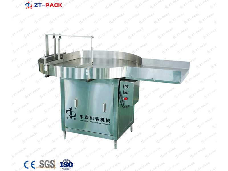 Вращающийся накопительный стол используется в упаковочных линиях для автоматической подачи бутылок. Диаметр стола составляет 1200 мм, а скорость подачи регулируется. Устройство может применяться в фармацевтической, пищевой и химической промышленности.